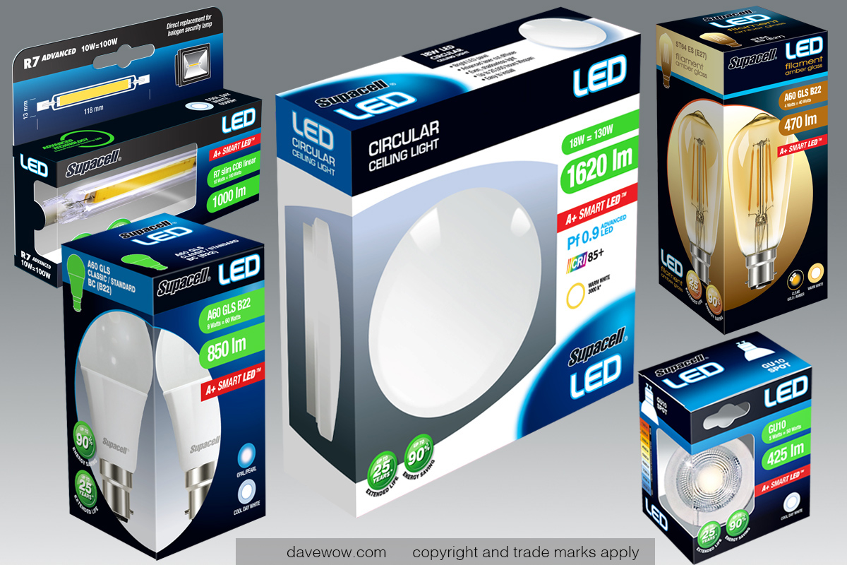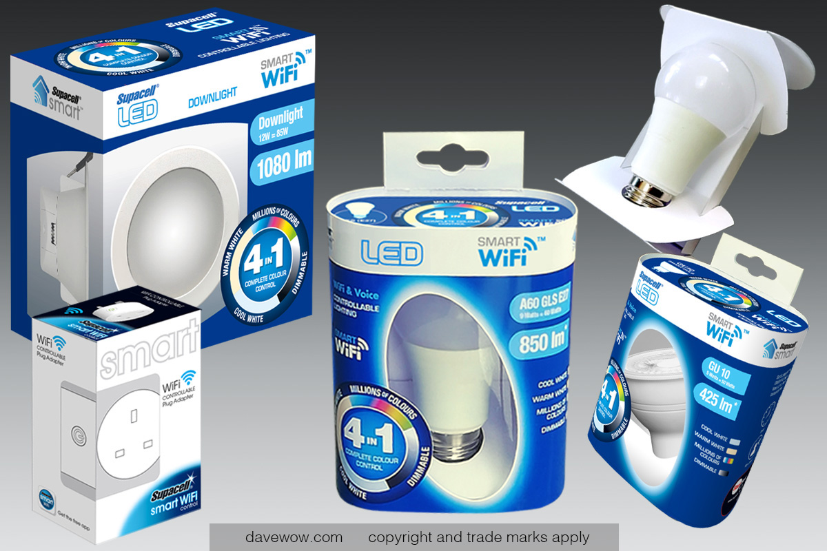 A range of LED WiFi smart lamps and other devices (heaters, curtain tracks, plug sockets ). Some unique pack and insert engineering.