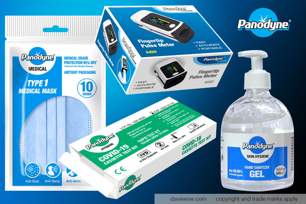 A whole range of products including masks, gloves, hand gel, thermometers, test kits, overalls and aprons. Logo , graphics and pack design.